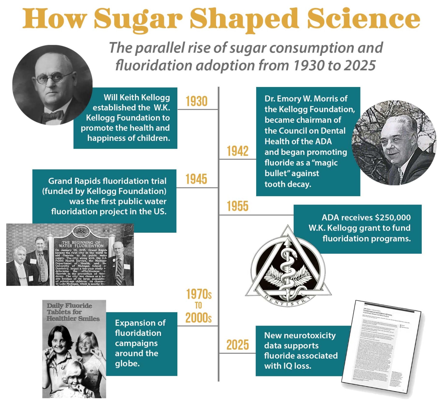 Neurath’s research reveals that in 1942, Emory Morris—a former dentist, Kellogg Company executive, and later president of the W.K. Kellogg Foundation—was appointed chair of the American Dental Association’s Committee on Dental Health Policy. Under his leadership, the ADA began to promote fluoride as a “magic bullet” against tooth decay while de-emphasizing the importance of reducing sugar consumption.