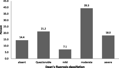 Whilst, a higher prevalence of dental fluorosis among females was reported in a few studies [8, 20] and one study reported a higher prevalence among the males [9], the present study did not find any significant difference in burden of fluorosis between the sexes. Our study findings are consistent with research conducted among rural school children in Uttar Pradesh [21]. A study conducted in 2009 among primary school children in Chikkaballapur district of Karnataka [20], showed an increased prevalence of very mild dental fluorosis, according to the Dean’s Fluorosis Index when compared with other categories. Our study suggests highest prevalence of moderate fluorosis which was 39.3 percent among participants.