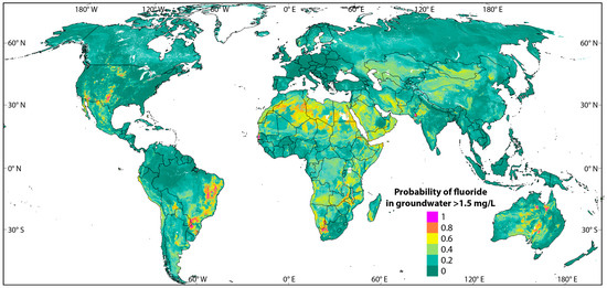 Figure 1. Probability of the likelihood of elevated fluoride contents in drinking water above the WHO recommendations in global perspective. Adapted from Podgorski and Berg, 2022 [18]. Online source: GAP, Groundwater Assessment Platform (2015), Swiss Fedral Institute of Aquatic Science and Technology (Eawag), Postfach 611, 8600 Dübendorf, Switzerland.
