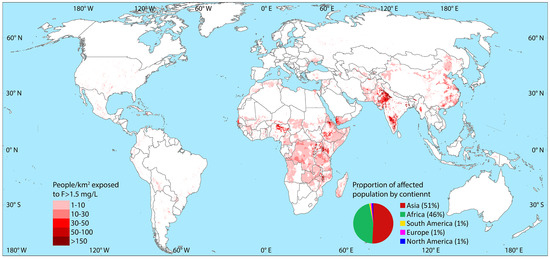 Figure 2. Estimated population potentially exposed to fluoride concentrations in drinking water greater than 1.5 ppm (WHO recommendation). Adapted from Podgorski and Berg, 2022 [18]. Online source: GAP, Groundwater Assessment Platform (2015), Swiss Fedral Institute of Aquatic Science and Technology (Eawag), Postfach 611, 8600 Dübendorf, Switzerland. https://www.gapmaps.org/Home/Public#, accessed on 31 October 2025.