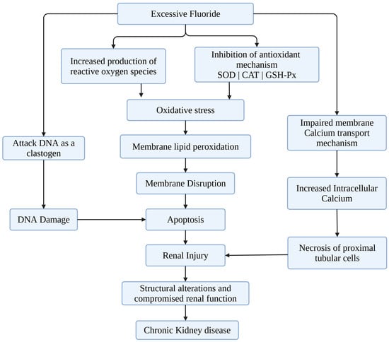 Fluoride enhances the generation of reactive oxygen species (ROS), depletes endogenous antioxidants such as superoxide dismutase (SOD), catalase, and glutathione, leading to oxidative stress. ROS results in cell injury by damaging lipids, protein, and DNA when they are produced in excess or the antioxidant defense is impaired. Oxidative stress affects regular cellular function and triggers inflammatory responses, further supporting renal injury. Moreover, fluoride-mediated nephrotoxic effects also encompass inhibition of crucial enzyme activities that are necessary for renal function. Particularly, the enzymes involved in energy metabolism such as ATPases are impacted, leading to diminished energy production and compromised cellular functions. In addition, fluoride exposure disrupts the electrolyte balance which is crucial for maintaining cellular homeostasis and optimal renal function. Chronic exposure to elevated fluoride levels has been linked to alterations in the expression of apoptosis-related genes, resulting in excessive renal cell death, loss of functional nephrons, and progressive decline in kidney efficiency. In addition, fluoride has been implicated in the development of renal fibrosis, marked by abnormal accumulation of extracellular matrix components. This fibrotic remodeling increases tissue rigidity, hampers glomerular filtration, and may ultimately progress to chronic kidney disease [36]. Prolonged exposure to elevated fluoride levels can overwhelm renal clearance mechanisms, leading to the accumulation of fluoride within kidney tissues and consequent toxicity [37]. A summary of fluoride-mediated nephrotoxicity pathways is given in