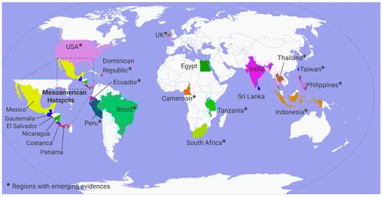Figure 4. Global prevalence of CKDu: currently identified hotspots and regions with emerging evidence for the presence of CKDu adapted from Gunasekara et al., 2020 [58].