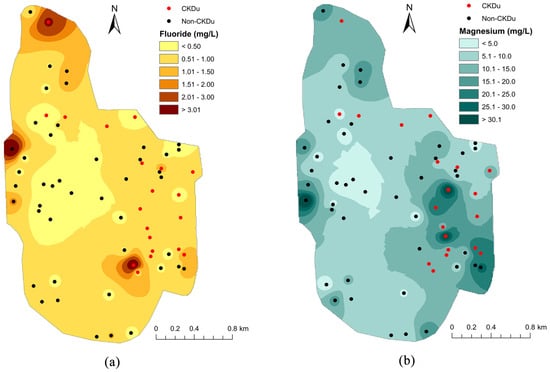 Figure 5. Spatial distribution of (a) groundwater fluoride, and (b) magnesium in Ginnoruwa area in relation to CKDu incidence. Adapted from Balasooriya et al., 2019 [75].