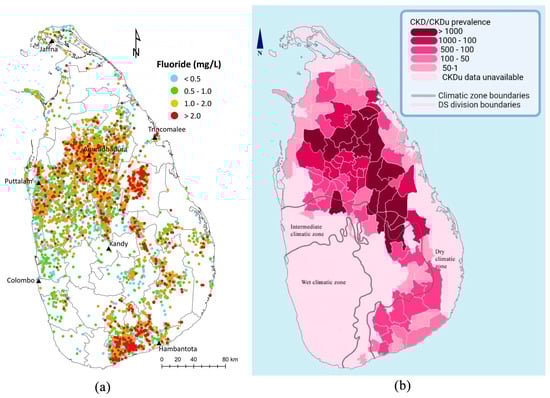 Figure 6a) [88]. Considering the emerging evidence from Sri Lanka showing a potential correlation between fluoride exposure and CKDu, examination of spatial overlap of fluoride distribution and CKDu prevalence can be insightful (