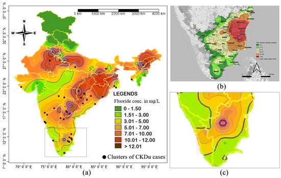 Figure 7b depicts the epidemiology of CKDu in the districts of Villupuram and Puducherry in southern India [91]. Overlaying the CKDu hotspots in these districts with the corresponding geospatial fluoride distribution map (